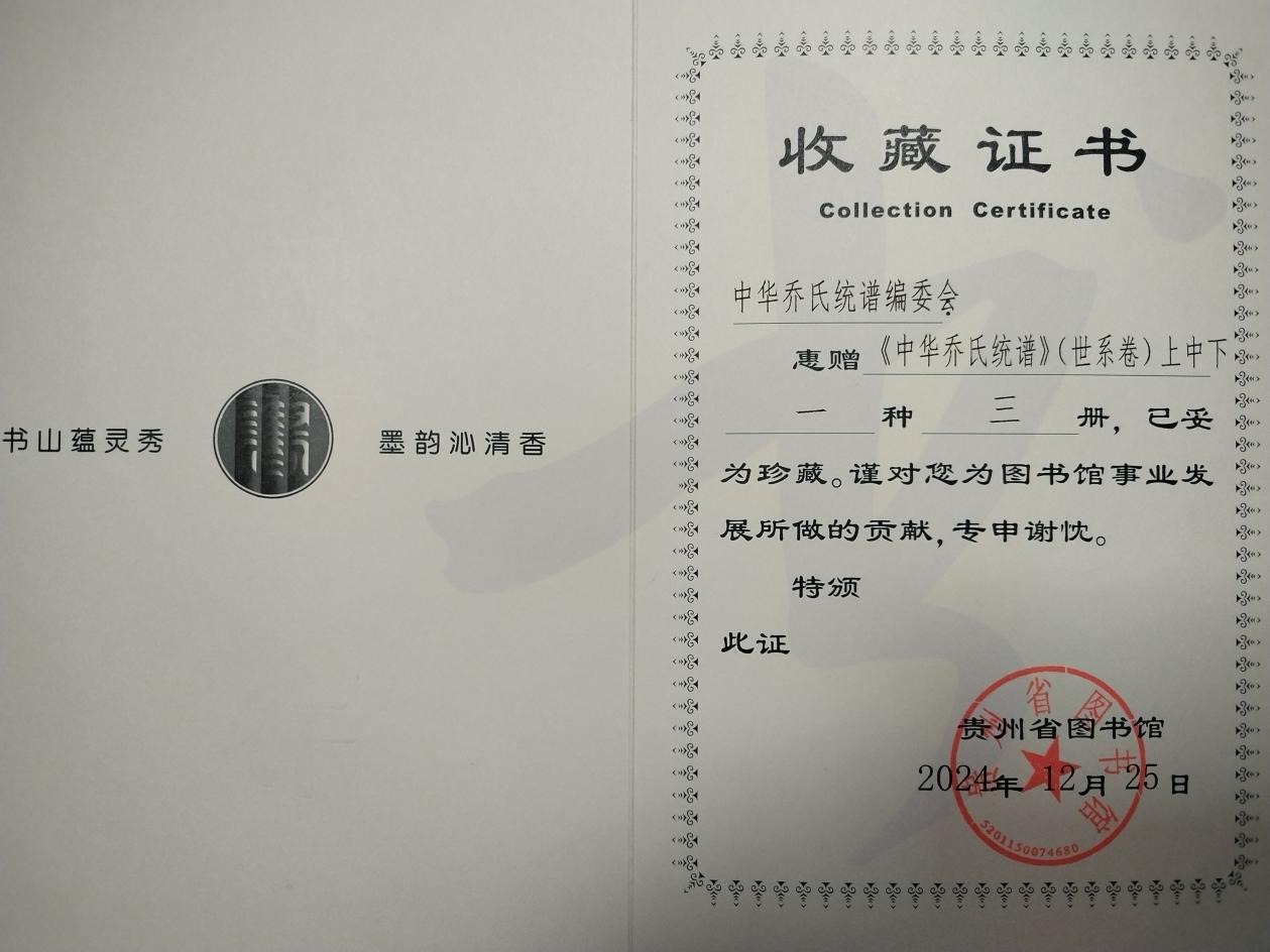 自2019年1月11日捐赠《中华乔氏统谱》(总谱),2020年7月29日捐赠《中华乔氏统谱》(人物卷)后,本次捐赠《中华乔氏统谱》(世系卷),贵州省图书馆己接受乔氏捐赠三部共五册乔氏统谱!